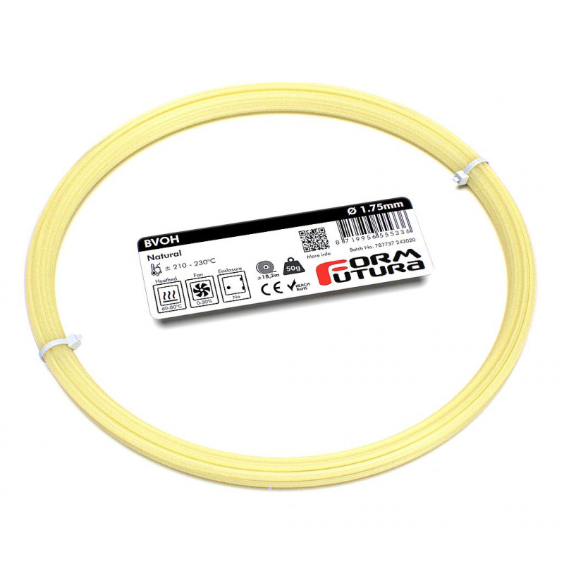 FormFutura's BVOH - Butenediol Vinyl Alcohol Co-polymer - 3D printer filament is an advanced water-soluble support material for complex multi-extrusion 3D printing. BVOH bonds to nearly all 'build materials' and it dissolves in water at a faster rate than PVA support materials. Its thermal stability is optimized to eliminate any risk of your hot-end clogging up by thermal degradation.