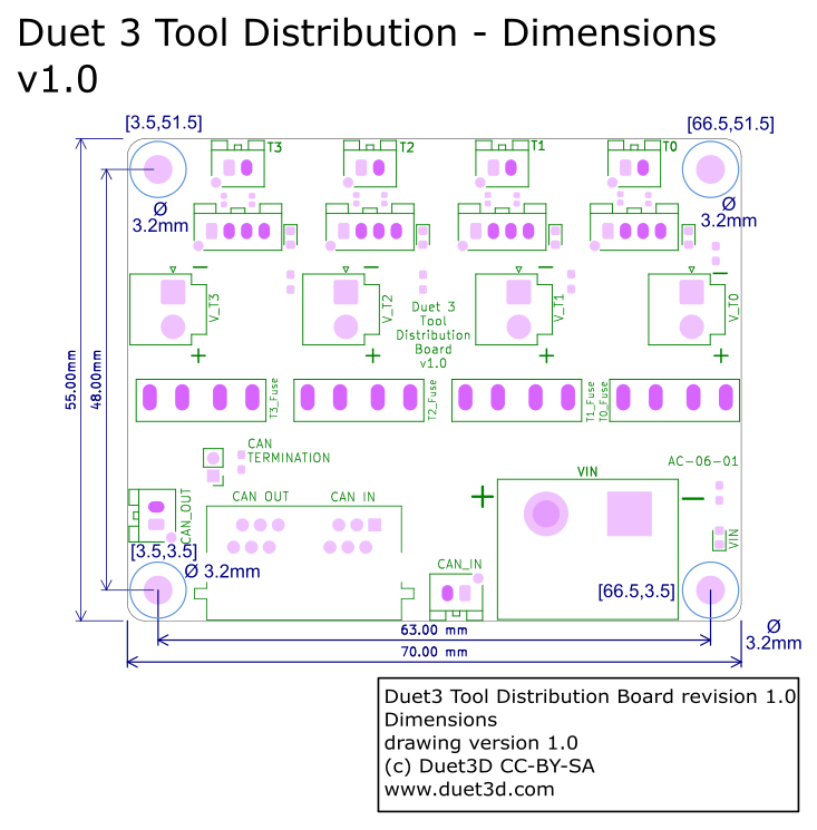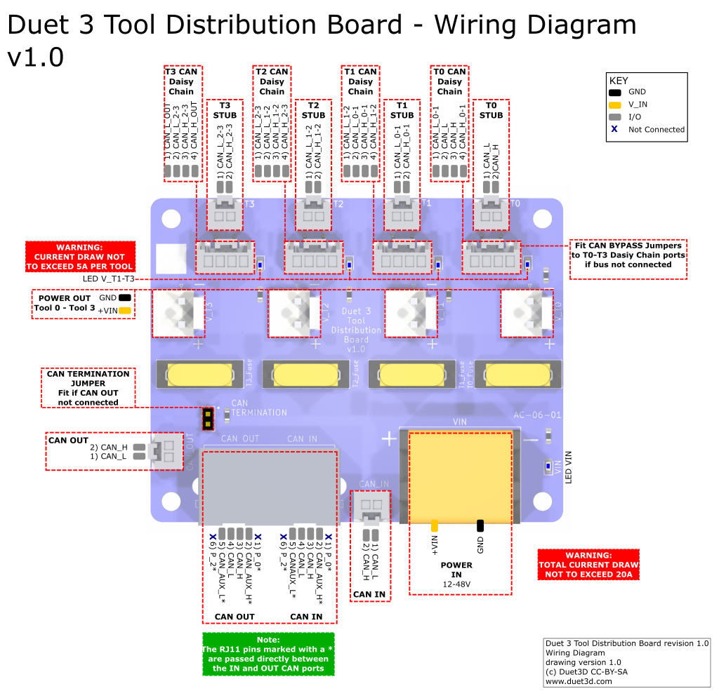 Das Duet 3 Tool Distribution Board wurde entwickelt, um den Anschluss mehrerer Duet 3 Toolboards 1LC und/oder Duet 3 Roto Toolboards an den Duet 3 CAN-FD-Bus zu vereinfachen. Es bietet Ausgänge für CAN und Stromversorgung, Busdurchgang und Busabschluss. Zwischen Version v0.5 und v1.0 wurde eine wesentliche Änderung vorgenommen, um die Verdrahtung zu vereinfachen, insbesondere die Verdrahtung von Abzweigungen (Stubs).