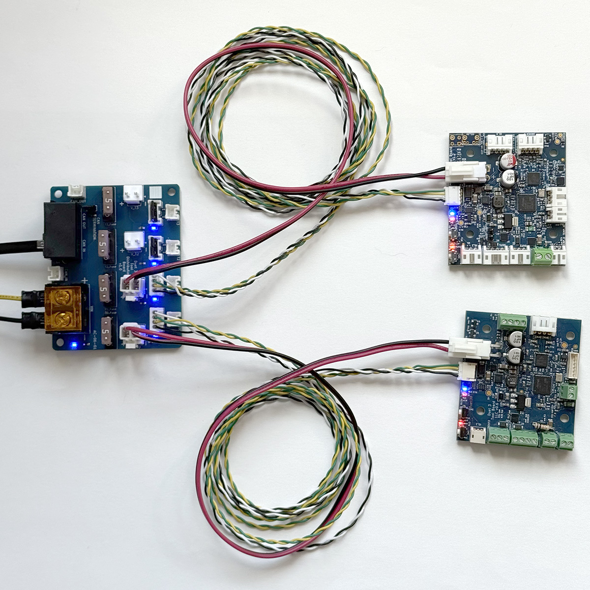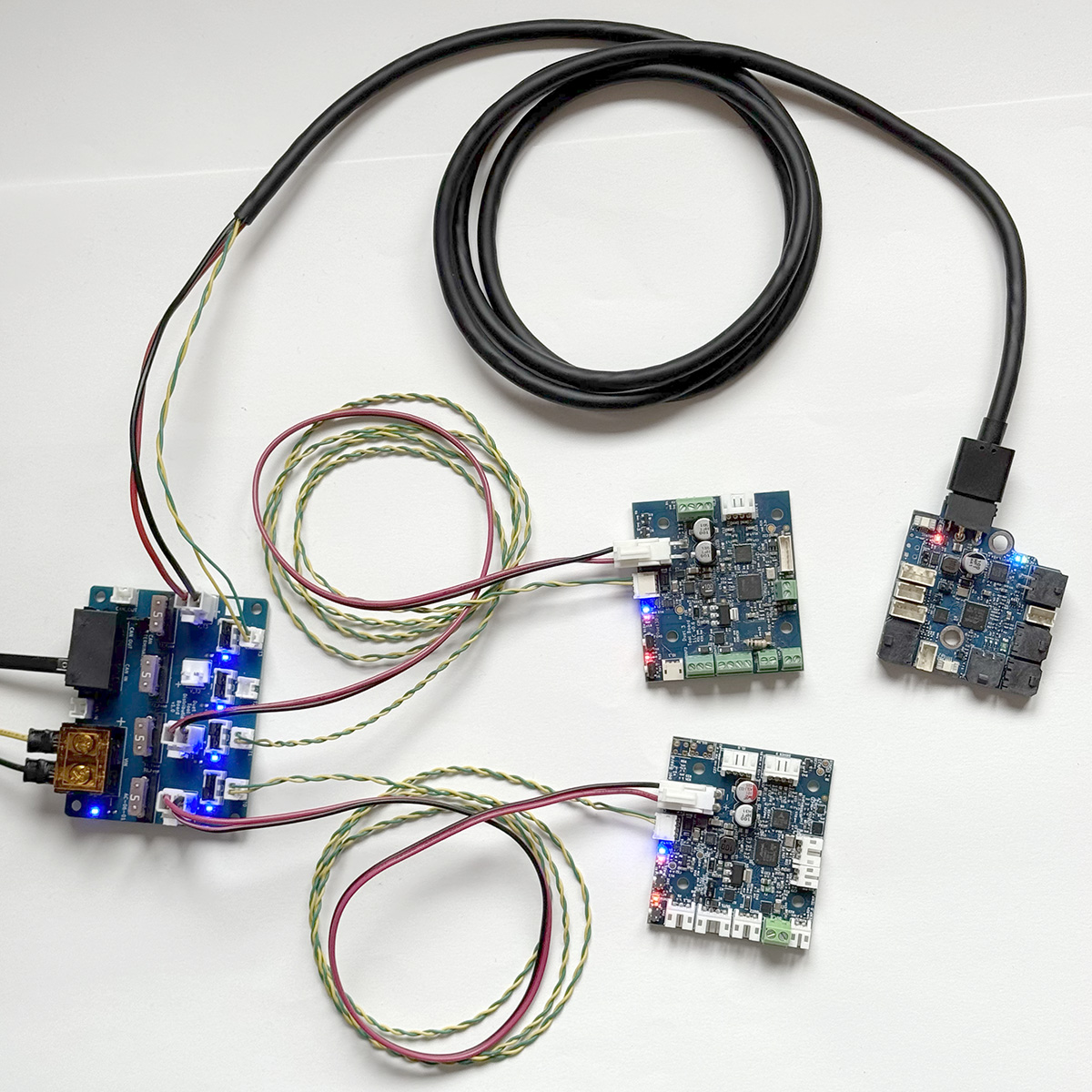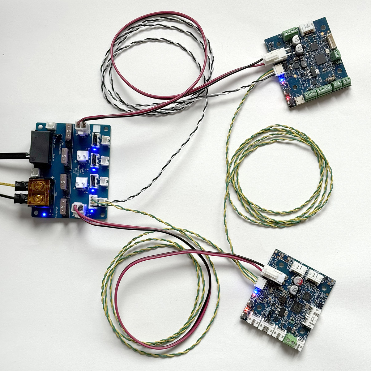Einige Erweiterungsplatinen und Werkzeugplatinen haben nur einen 2-poligen CAN-Anschluss, z. B. die Duet 3 Roto Toolboard, der Scanning Z Probe und Hauptplatinen, die als Erweiterungsplatinen verwendet werden. Dies erfordert eine 2-Draht-Verbindung. In Wirklichkeit können alle Erweiterungsplatinen, Werkzeugplatinen und Hauptplatinen (die als Erweiterungen verwendet werden) mit nur zwei CAN-Drähten verbunden werden. Diese Art der Verbindung funktioniert als Abzweigung vom Haupt-CAN-Bus, die als "Stichleitung" bezeichnet wird.
