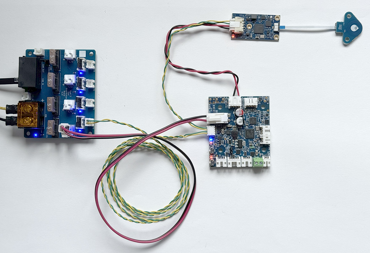 - Legen Sie eine Spannung zwischen 12V und 48V an den 2-Wege-Stromanschluss auf der Platine an und achten Sie dabei auf die richtige Polarität.