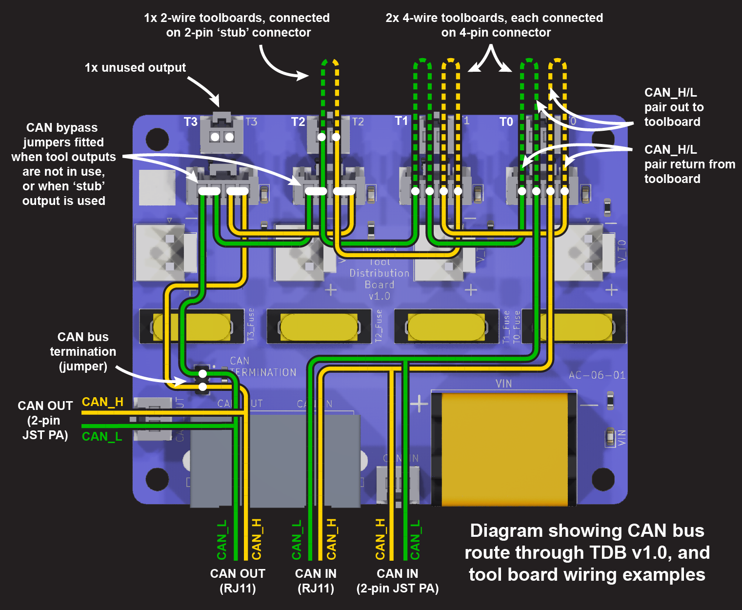 Da die Werkzeugverteilerplatine lediglich einen bequemen Anschlusspunkt darstellt, um eine Schleife im CAN-Bus zu bilden, können mehrere Platinen innerhalb jeder Schleife von der Platine selbst angeschlossen werden.