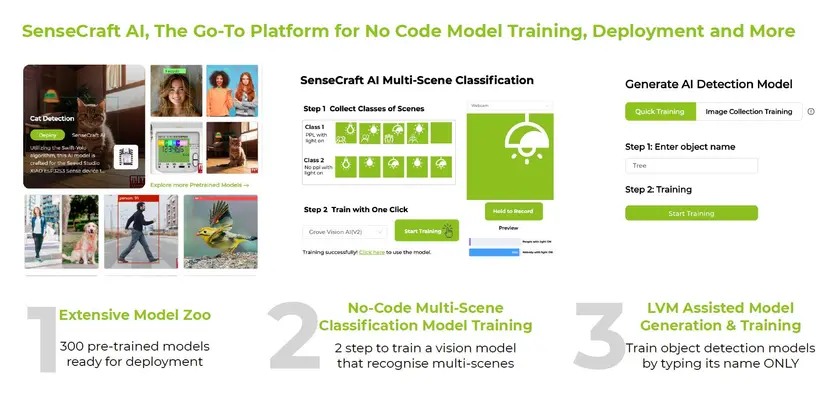 Darüber hinaus bietet sie einen codefreien Zugang zu über 300 vortrainierten Modellen oder die Erstellung und das Training von kundenspezifischen Modellen über die SenseCraft AI-Plattform. Unterstützt die Verteilung von Modellen aus den Frameworks TensorFlow Lite und PyTorch.