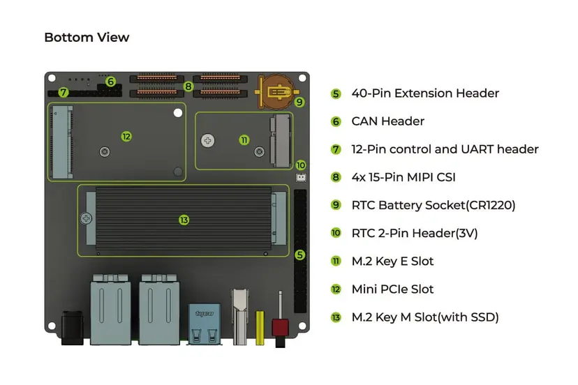 Enthält 2×RJ45 Gigabit Ethernet, SIM-Kartensteckplatz, 4×USB 3.2, HDMI 2.1 und CAN. Außerdem bietet es M.2 Key E/M, Mini-PCIe und 4×CSI für Konnektivität und Kameras.
