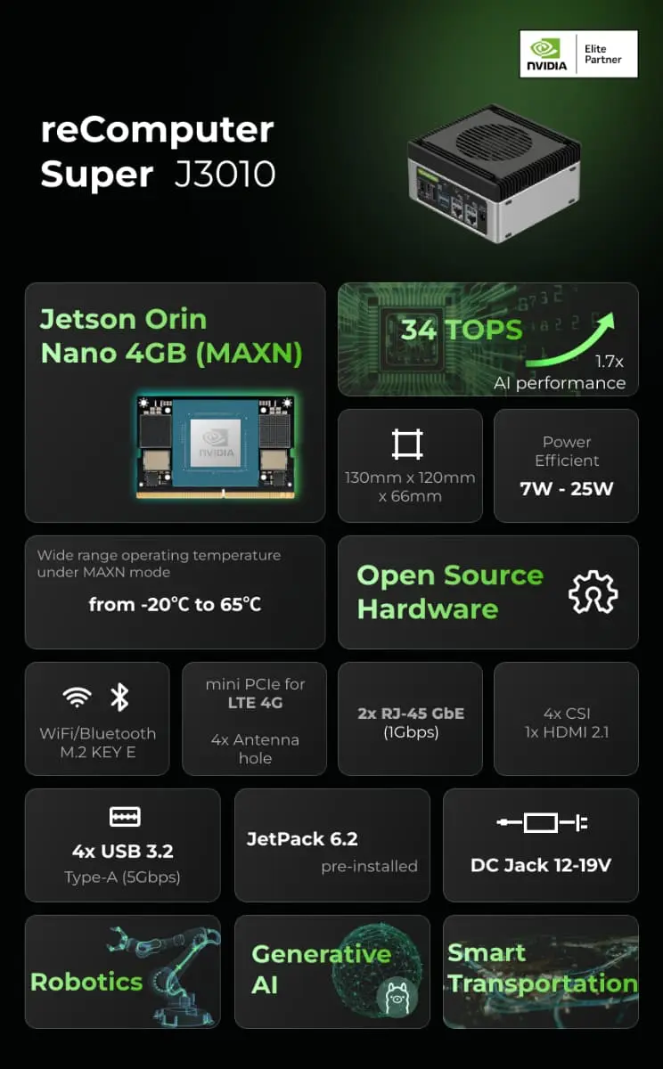 Die reComputer Super Jetson™ Serie ist ein intelligentes KI-Edge-System, das auf der NVIDIA® Jetson™ Orin™ Plattform basiert. Es bietet eine herausragende KI-Leistung von 34 TOPS bis zu 157 TOPS im Super-Modus und wurde für anspruchsvolle Anwendungen wie Vision AI, Robotik und generative KI entwickelt.