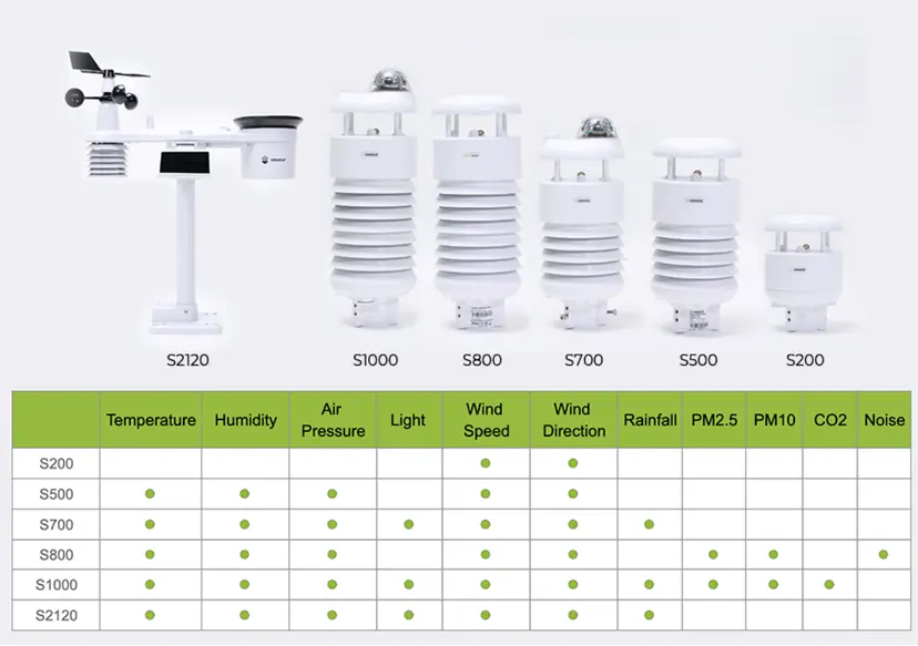 Derkompakte 10-in-1-Wettersensor S1000 misst Lufttemperatur, relative Luftfeuchtigkeit, Luftdruck, Lichtintensität, Niederschlag (optisch), Windgeschwindigkeit, Windrichtung (Ultraschall), PM2,5, PM10 und CO₂. Er ist ideal für Anwendungen in rauen Umgebungen wie Außenbereiche, Landwirtschaft oder Smart Cities.