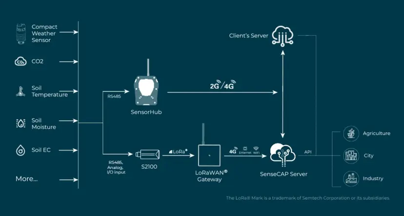 Der SenseCAP S2100 - LoRaWAN® Data Logger und der Sensor Hub 4G Datenlogger in Industriequalität mit MODBUS-RTU RS485 Protokoll sind mit den Wettersensoren der SenseCAP ONE Serie kompatibel. Mit diesen Geräten können Sensordaten an öffentliche LoRaWAN® Netzwerkserver (wie Helium, TTN, etc.) oder an private Server übertragen werden.
