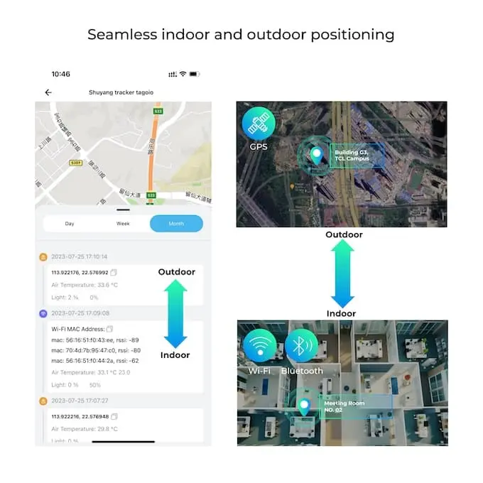Verwendet BLE und Wi-Fi für die präzise Positionierung in Innenräumen und GNSS-Technologie für die genaue Verfolgung im Freien.