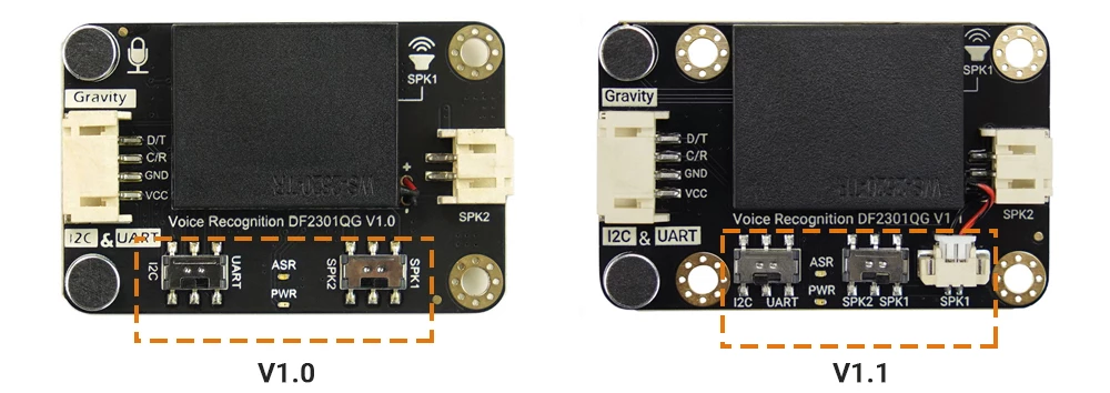 Nota: I magazzini DFRobot contengono sia la versione V1.0 sia la versione V1.1 di questo modulo. Potresti ricevere una delle due versioni. Resta tranquillo: entrambe le versioni offrono le stesse funzionalità principali di riconoscimento vocale, prestazioni e caratteristiche chiave descritte in questa scheda prodotto.