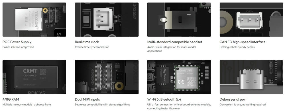 Progettato per garantire la massima affidabilità, l’RDK X5 è pensato per integrarsi facilmente in qualsiasi progetto ROS. Dispone di Wi-Fi 6 dual-band e Bluetooth 5.4 per una comunicazione wireless stabile e ad alta velocità. Per un’integrazione industriale più solida, la scheda include un’interfaccia CAN FD ad alta velocità e il supporto Power over Ethernet (PoE), semplificando il cablaggio e l’installazione in qualsiasi sistema autonomo.
