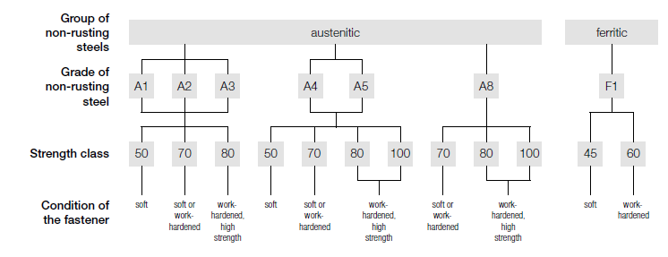 Stainless screws are classified according to DIN EN ISO 3506, which divides screws into steel groups, steel grades and strength classes.