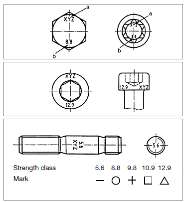 - Hexagonal screws: Manufacturer's marking and strength class.