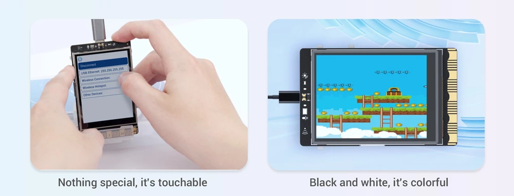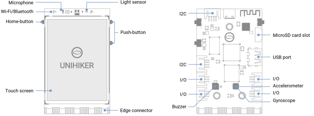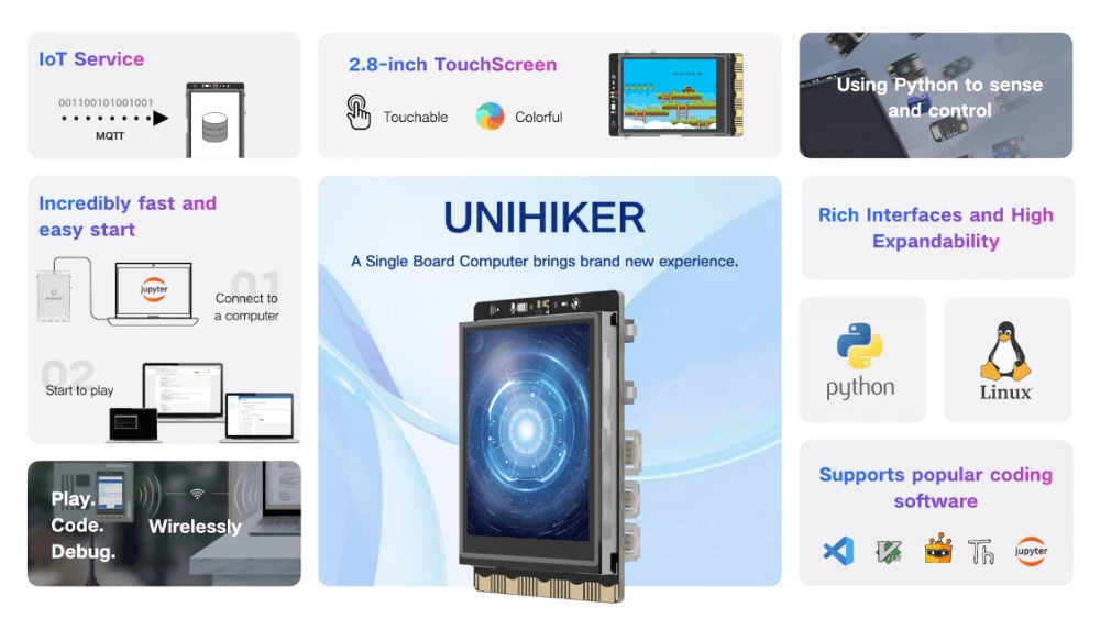 UNIHIKER is a single-board computer that offers a completely new experience. It features a 2.8-inch touchscreen, Wi-Fi and Bluetooth connectivity. It also has a light sensor, accelerometer, gyroscope and microphone. Thanks to the built-in co-processor, it can communicate with various analog/digital/I2C/UART/SPI sensors and actuators.