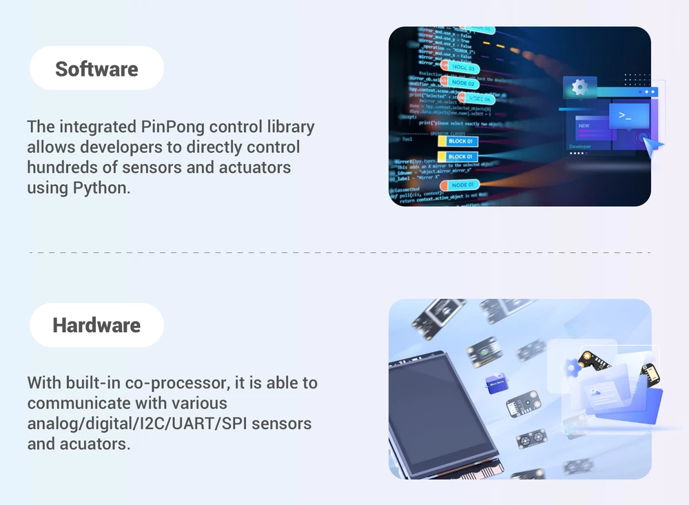 Like other single-board computers, UNIHIKER also supports VS Code, VIM and Thonny. The built-in PinPong control library allows developers to directly manage UNIHIKER's internal sensors and hundreds of connected sensors and actuators using the Python language.