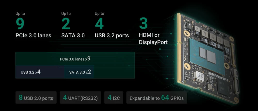 - Amplia gama de pines de expansión, incluyendo: 3 puertos HDMI/DisplayPort, 8 puertos USB 2.0, hasta 4 puertos USB 3.2, 9 líneas PCIe 3.0, 2 puertos SATA 3.0, 64 GPIO ampliables, etc.
